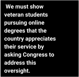 Each year, more than 700,000 veterans rely on the GI Bill to pay for their education, but those who pursue online degrees don’t receive their benefits in full. We must show veteran students pursuing online degrees that the country appreciates their service by asking Congress to address this oversight.